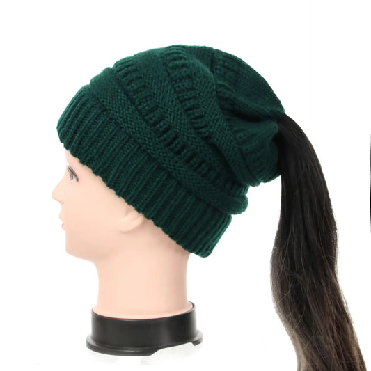 Women’s Autumn Winter Ponytail Beanie – Stretch Knitted Crochet Hat with Ponytail Hole, Solid Color Warm Cap